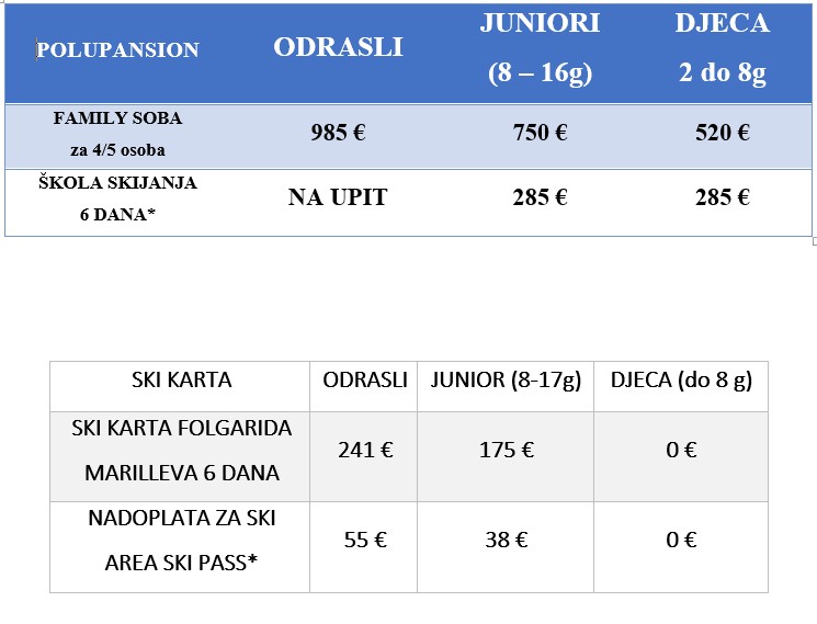 * Škola skijanja održavat će se svaki dan 10 – 13h te dva dana i popodne 14 – 16h prema dogovoru sa trenerima.